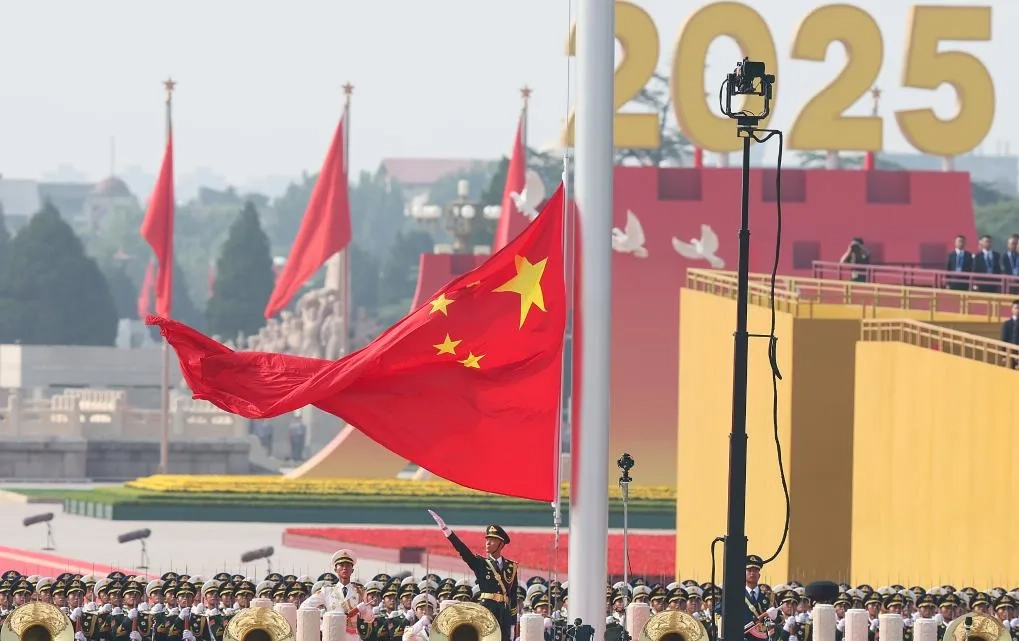 9月3日,紀念中國人民抗日戰爭暨世界反法西斯戰爭勝利80周年大會在北京隆重舉行。這是天安門廣場舉行隆重的升國旗儀式。